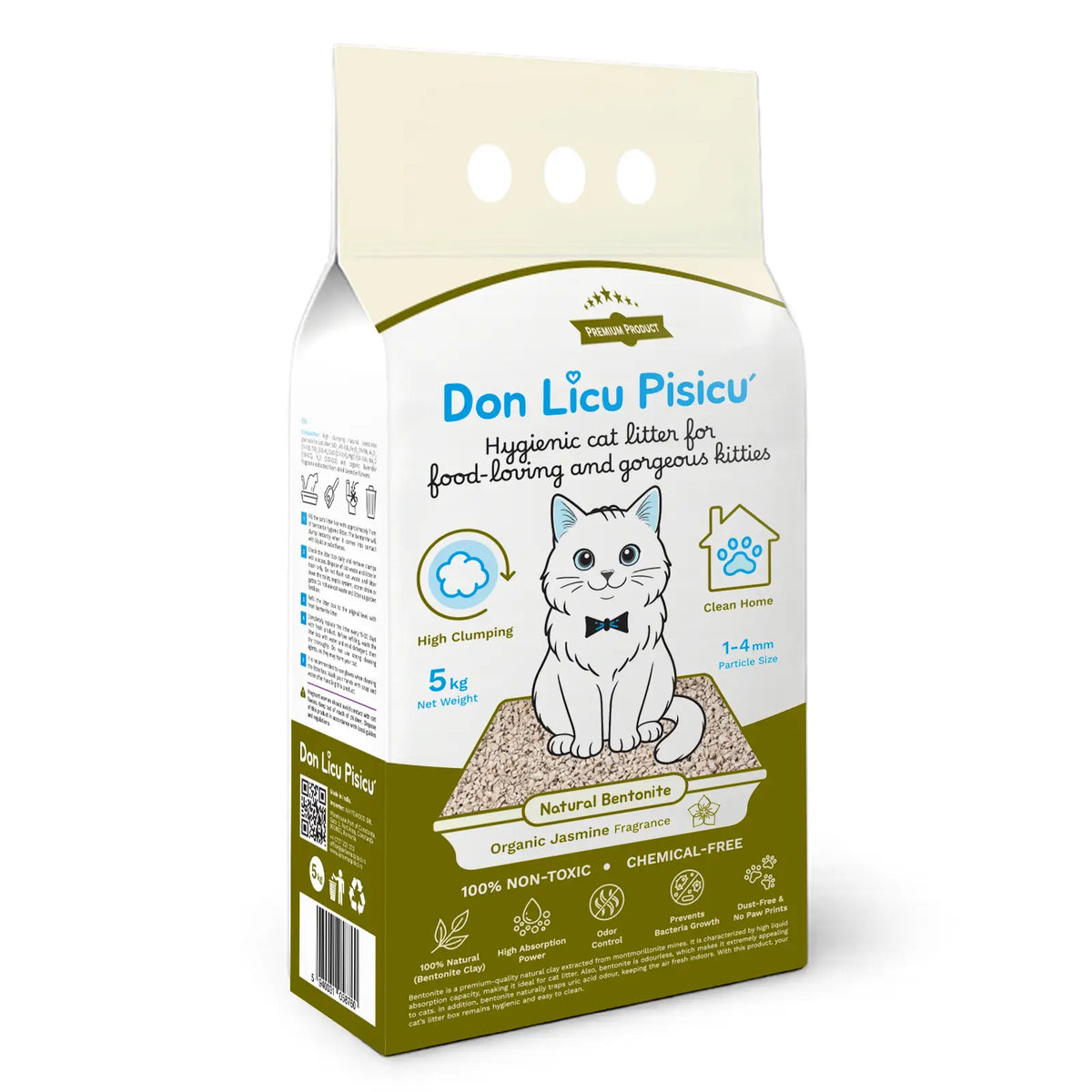 Higiénikus macskaalom: 100% természetes bentonit, organikus jázmin illattal, vegyi anyagok nélkül, 5 kg
